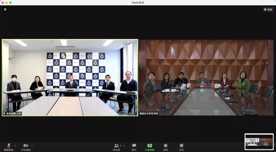 在福建省人民政府外事办公室的牵线促成下,12月20日上午,我校与日本长崎国际大学举行首次工作视频会议,就两校合作交流事宜进行了沟通和探讨。长崎国际大学副校长木村胜彦、人类社会学部学部长池永正人、社会福祉专业主任胁野幸太郎等在线参会。我校副校长商光美,国际合作与交流处、教务处、教育学院相关负责人以及家政学专业和日语专业教师代表等参加会议。