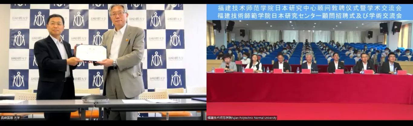赖海榕书记在致辞中回顾了两校自去年下半年以来围绕双方社会福祉专业和家政学专业,以及中日经贸、文化等合作领域上开展共同研究等合作事宜的推进情况,并对近日刚刚签署的两校合作备忘录表示祝贺。双方在线共同展示了合作备忘录。他对木村胜彦副校长同意受聘为我校日本研究中心顾问表示衷心的感谢,并代表学校诚挚邀请木村副校长和长崎国际大学各位同仁在疫情过后拨冗莅临学校开展交流。