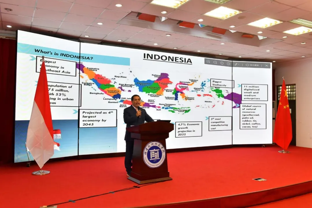 周浩黎大使围绕《中印尼关系的最新情况》这一主题,向师生生动介绍了印尼的基本国情,系统梳理了中印尼外交关系史和“两国双园”项目的推进历程,并深入浅出地分享了印尼作为G20轮值主席国的重点工作事项。他指出,印尼和中国有着良好的合作契合点,我校刚刚揭牌成立的中印尼产业合作研究中心这一智库有助于服务“两国双园”项目的全面实施,大有可为。他希望青年大学生能不断加强学习,为未来两国经济、人文等方面的深入交流作出贡献,共创更加美好的未来。