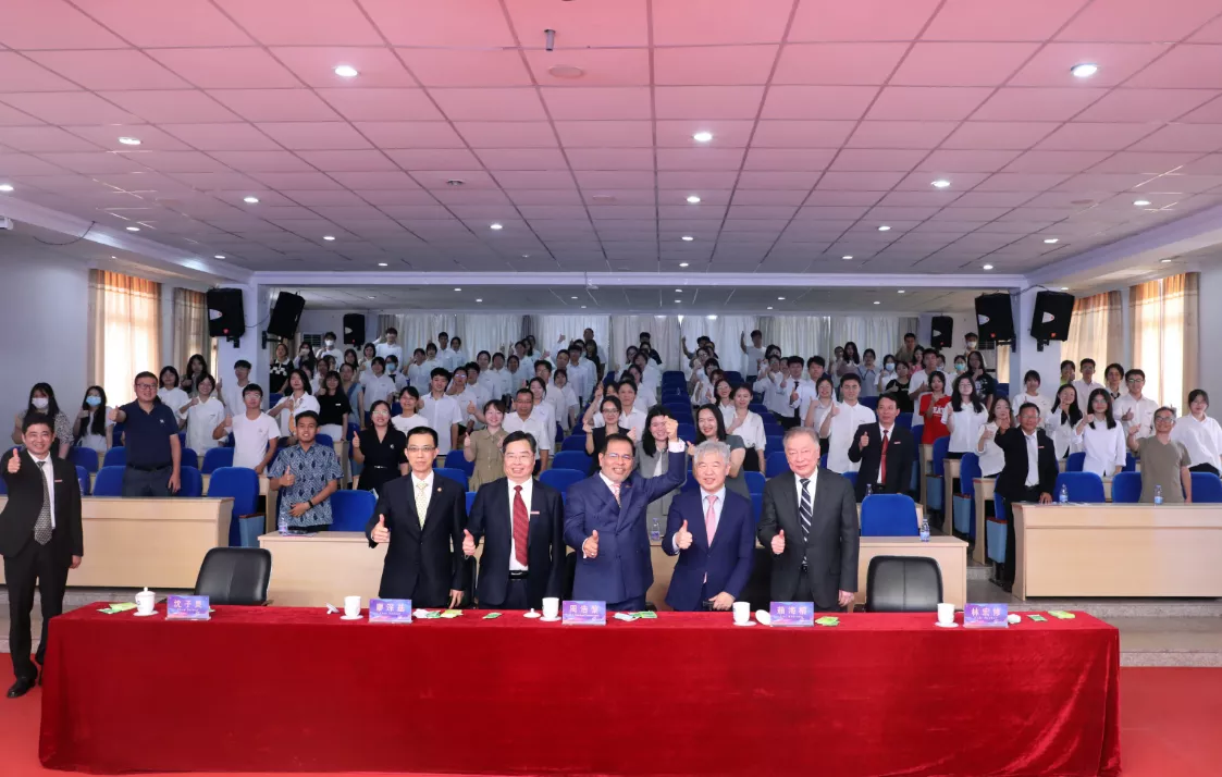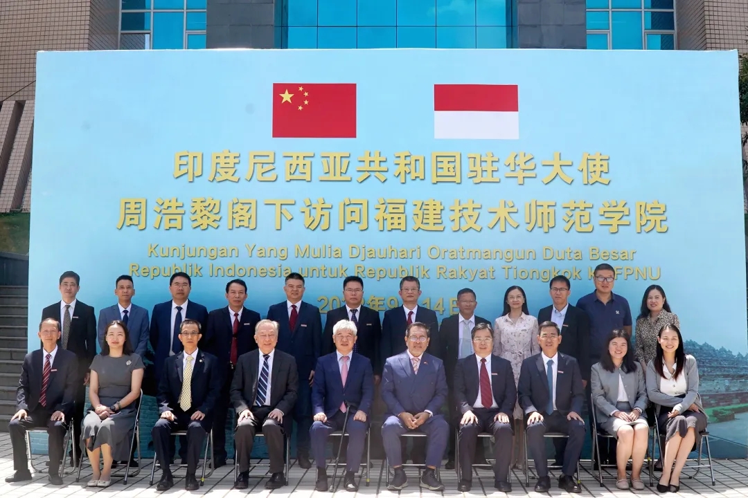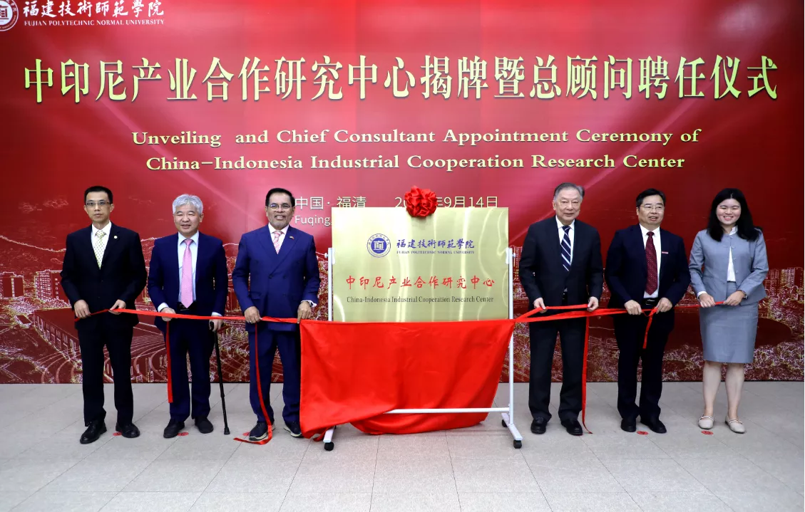 仪式上,周浩黎大使、沈子灵处长、杨丽晴二等秘书、林宏修董事长、赖海榕书记、廖深基校长等共同为福建技术师范学院中印尼产业合作研究中心揭牌。