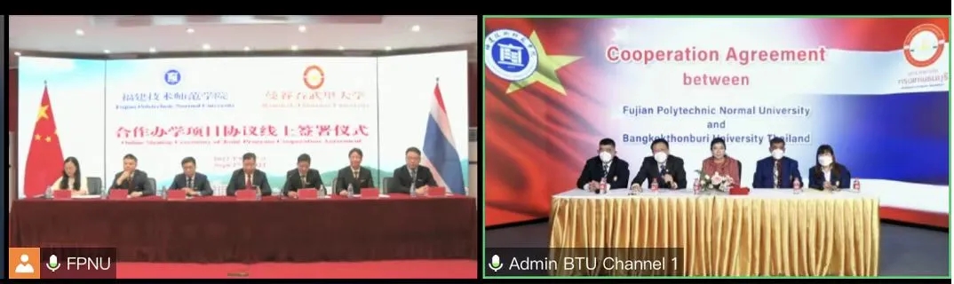 9月27日上午,我校通过视频方式与泰国曼谷吞武里大学举行合作办学项目协议签署仪式。曼谷吞武里大学校长邦雯·班扎提坤(Bangorn Benjathikul)、助理校长Sa-Ngai、助理校长林栩、传媒艺术学院院长Sukanya Buranadechachai、体育学院院长Prakit Hongsaenyatham等在线参加。我校校长廖深基出席仪式,并与班扎提坤校长共同签署合作办学项目协议。国际合作与交流处、教务处、财务处、文化传媒与法律学院等单位负责人参加仪式。