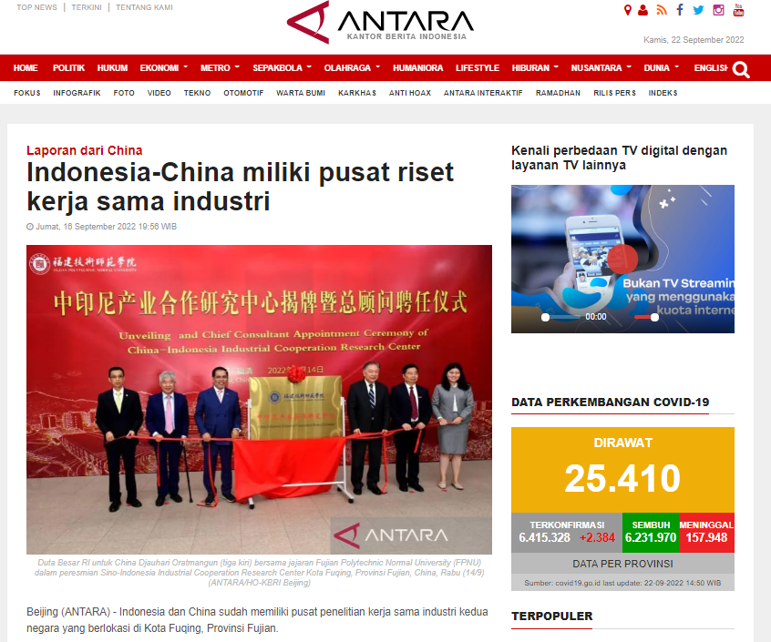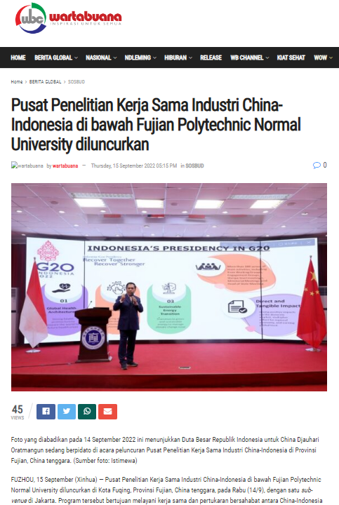 1.Pusat Penelitian Kerja Sama Industri China-Indonesia di bawah Fujian Polytechnic Normal University diluncurkan(福建技术师范学院中印尼产业合作研究中心成立),新华社记者采编