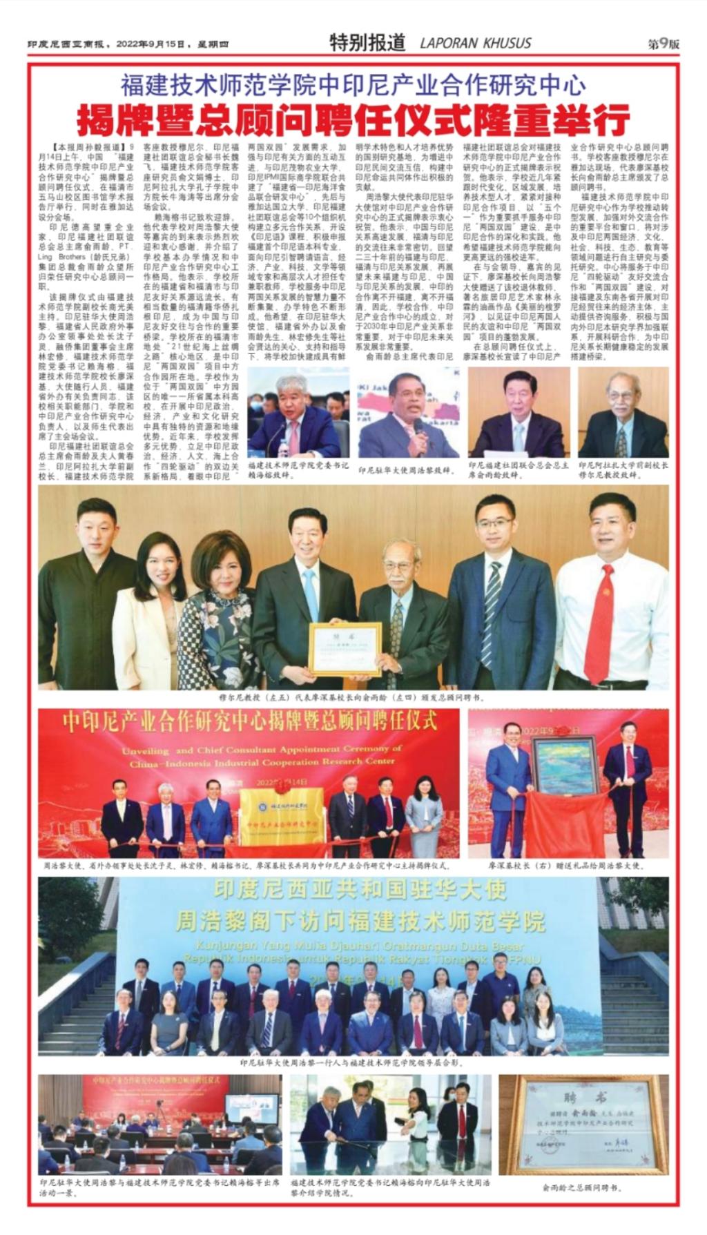 5.福建技术师范学院中印尼产业合作研究中心揭牌暨总顾问聘任仪式隆重举行,《印度尼西亚商报》