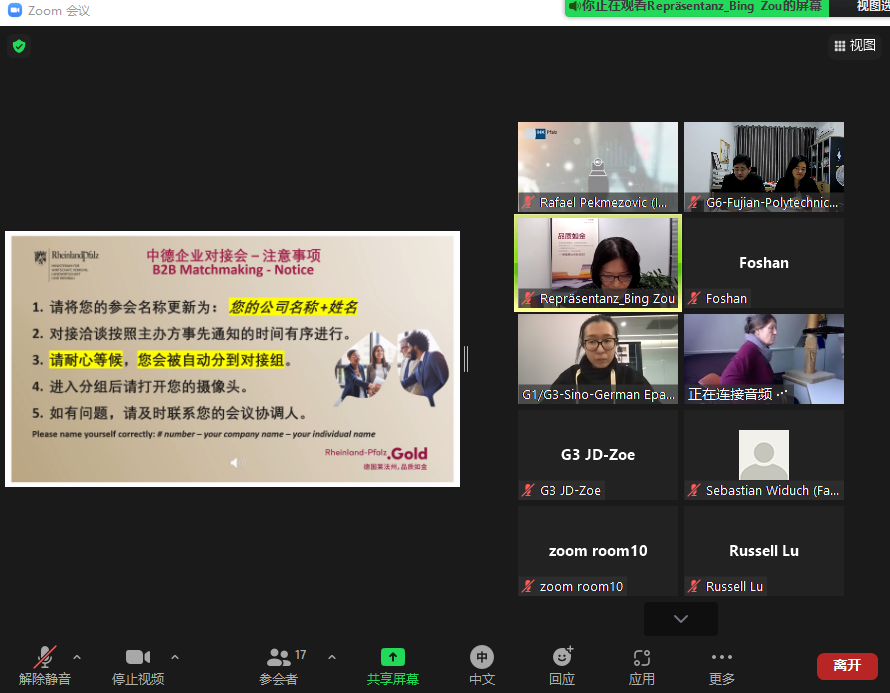 11月16日下午,我处相关负责人受邀参加德国莱法州线上推介会暨中德企业对接会,并与沃佰世职业教育集团(WBS Training)中国区 CEO Ms. Martina Wagner和国际合作主任唐斌进行深入交流。视频会上,双方简要介绍了各自的基本情况,并着重围绕职业教育挖掘合作点,旨在为我校职业教育教师发展联盟牵线搭桥,引进德国先进的职业培训体系。
