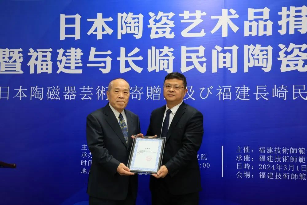 姜兴山副校长代表学校向田中满雄先生和陈健先生颁发感谢状。他指出,福建省和长崎县渊源深厚、交往频繁,互为日中友好交往的桥梁。在省外办的大力支持下,学校与长崎县有关高校建立了紧密联系,开展了友好合作。田中满雄先生此次向学校捐赠日本长崎平户烧,既是两地友好往来的美好见证,也为校地共同交流中日民间陶瓷文化提供了良好契机。他表示,真诚期待双方能进一步加强交流,加深了解,共同为中日文化交流添砖加瓦。