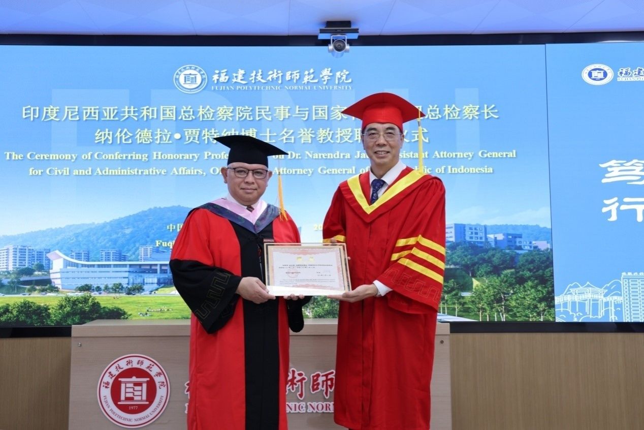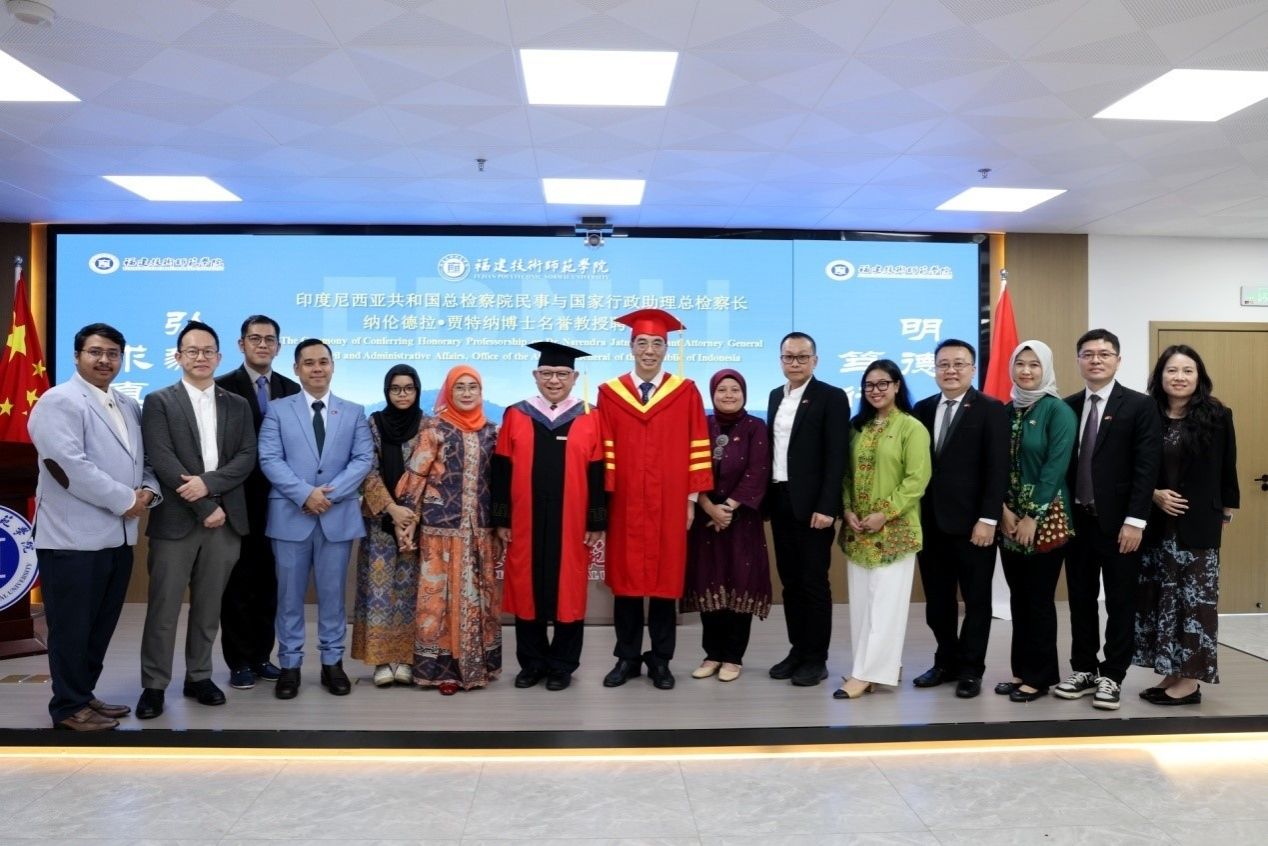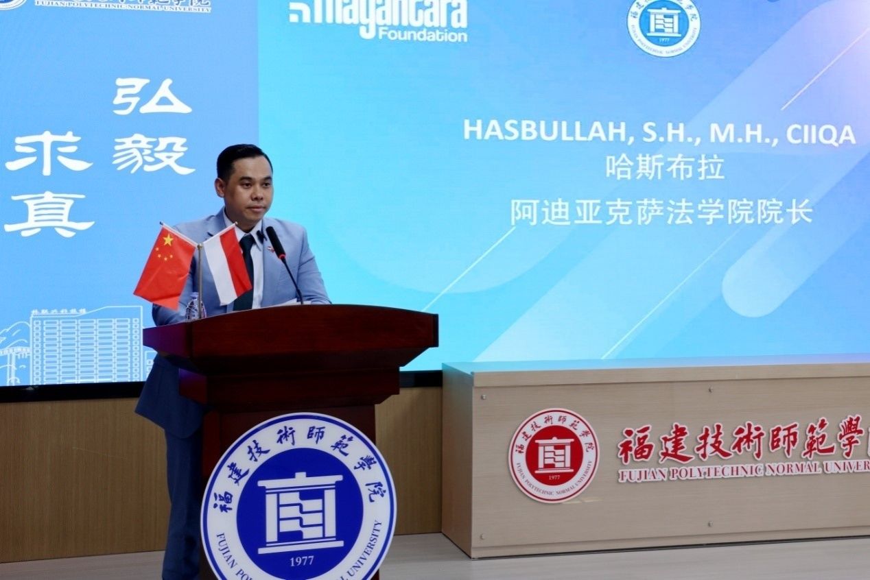 6月26日下午,我校在五马山校区林联兴科技楼集贤厅举行印度尼西亚阿迪亚克萨法学院代表团来校交流活动暨名誉教授聘任仪式。印度尼西亚总检察院民事与国家行政助理总检察长、阿迪亚克萨基金会理事会主席纳伦德拉·贾特纳博士(Narendra Jatna),印度尼西亚驻华大使馆公使衔参赞努尔·伊维·拉赫马瓦蒂(Nur Evi Rahmawati),印度尼西亚阿迪亚克萨法学院院长哈斯布拉(Hasbullah),印度尼西亚驻香港总领馆司法参赞亨利·金丹根(Henry Kindangen),印度尼西亚纳甘塔拉基金会理事会主席韩善美(Pusanti Ding) 及在华研修的青年检察官等一行26人出席活动。福清市人民检察院、福清市人民法院相关负责人受邀参加活动。