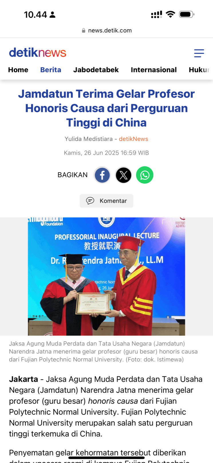 该活动目前已在印尼知名主流媒体《秒针新闻》(news.detik.com)及印尼检察院官方网站(restorasihukum.com)、印尼法律新闻网站(hukumID.com)、印尼法律信息中心新闻网站(story.kejaksaan.ID)、印尼北马鲁古远镜新闻网站(teropongmalut.com)等网站以《民事和国家行政事务副检察长纳伦德拉·贾特纳(Narendra Jatna)受聘中国高校荣誉教授》《民事和国家行政事务副检察长纳伦德拉·贾特纳(Narendra Jatna)受聘福建技术师范学院荣誉教授》等新闻标题第一时间报道。