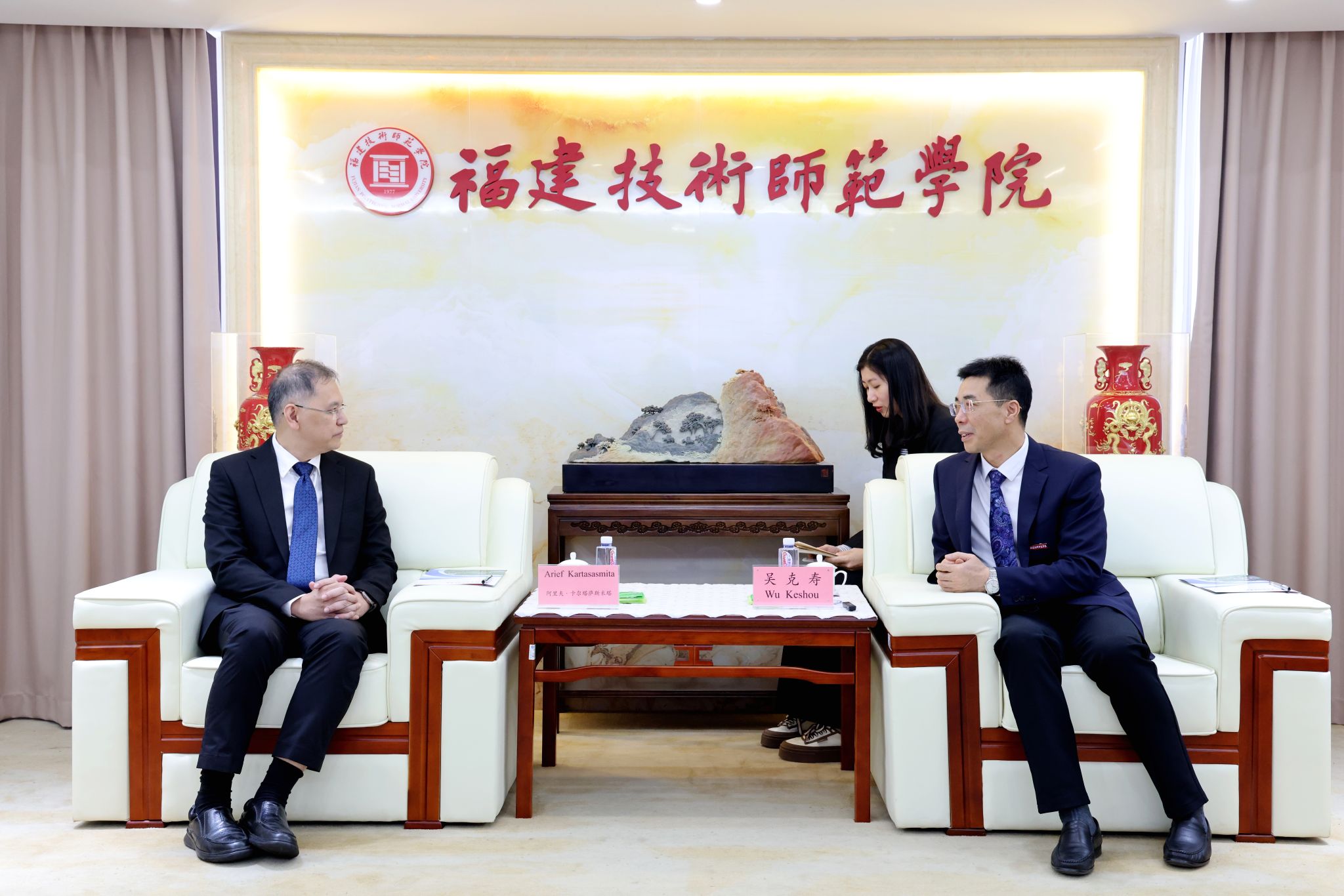 会上,吴克寿校长代表学校向阿里夫校长一行的到来表示热烈欢迎。随后,吴校长重点介绍了学校的办学定位、专业设置和围绕中印尼“两国双园”项目面向印尼开展的一系列合作交流情况。他希望两校搭建常态化师生互访、科研合作交流平台,聚焦产学研合作,推动科研成果转化和应用,服务地方和行业发展。